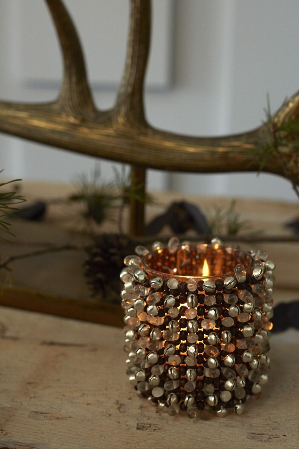 Pequeñas campanillas y cuentas adornan el Jobii Votive, un recipiente festivo con vibraciones navideñas antiguas. Un recipiente de vidrio se encuentra dentro del brazalete de cuentas de metal plateado y contiene una candelita o una pequeña vela sin llama.